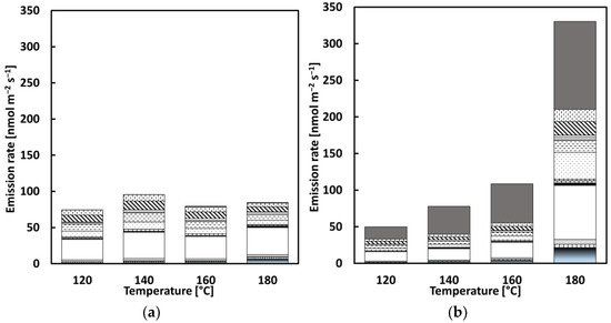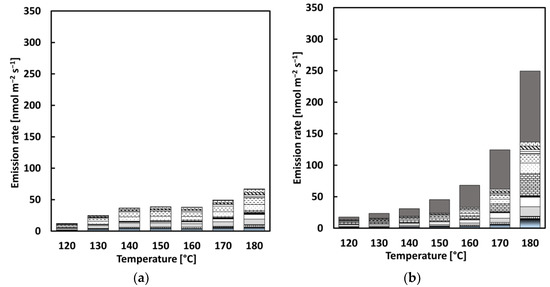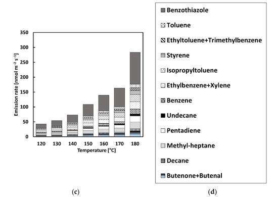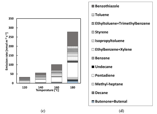 Distribution of VOC emissions with a step-by-step increase in temperature: (a) REF, (b) CRMB1, (c) CRMB2, and (d) legend.