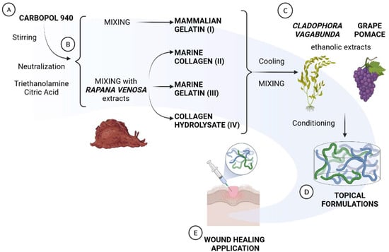 Schematic representation of the sequential steps in the preparation of the four different formulations: (A) Carbopol 940 dispersion in water, neutralization and stabilization; (B) mixing with mammalian gelatin (Formulation 1) or with Rapana venosa extracts (Formulations II, III and IV); (C) combination of the three formulations with Cladophora vagabunda and grape pomace extracts; (D) cooling and realization of the final formulations; (E) characterization of the formulations.