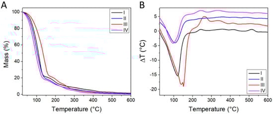 (A) Thermogravimetric Analysis (TGA) and (B) Differential Thermal Analyses (DTA) results for the different formulations. Each curve in (B), with the exception of formulation I, is shifted by +2 °C with respect to the previous one, for clarity.