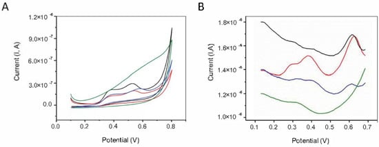 (A) Cyclic Voltammetry (CV) and (B) Differential Pulse Voltammetry (DP) of formulations: I (black line), II (red line), III (blue line), and IV (green line) in ethanol (0.1 M phosphate buffer of pH 7 (1/1 v/v)) at glassy carbon electrode (GCE). Scan rate 50 mV/s.
