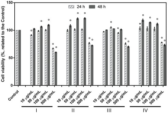 Viability of fibroblasts (NCTC clone L929, ATCC) cultivated in the presence of different concentrations of formulations I, II, III, IV, evaluated by MTT test at 24 and 48 h. Data represent the mean ± SD (n = 3). (* p < 0.05; ° p < 0.0001 compared to untreated control).