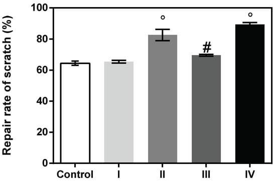 Repair rate of scratch (%) by cellular migration of human keratinocytes (HaCaT, ECACC) assessed by means of ImageJ 1.51 software. Data represent the mean ± SD. (# p < 0.001; ° p < 0.0001) compared to control.