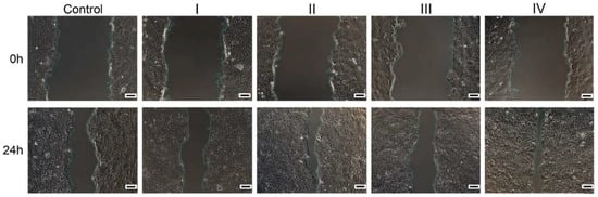After the scratch, wound closure was monitored collecting digitalized images at beginning of the experiment (time 0—immediately after the scratch) and after 24 h in order to evaluate the migration status of the cells and the coverage of the wounded area. To estimate cell migration, images of two sites per well through an inverted microscope (Axio Star Plus) and digital camera (Carl Zeiss, Jena, Germany) (10× objective) were captured. The wound areas were analyzed using ImageJ 1.51 software for quantitative analysis of the wound closure percentage, according to Equation (2). Four replicates per condition were used and three experiments were done.