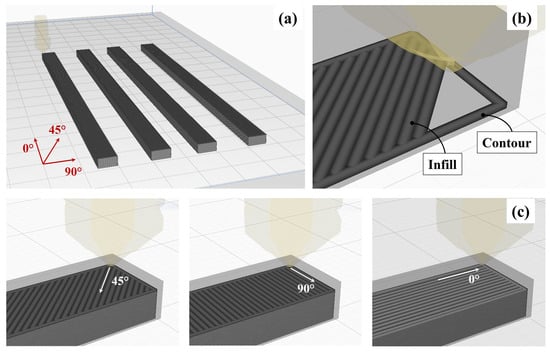 Schematic representation of specimens geometry (a), contour and infill lines (b) and considered printing direction (c).