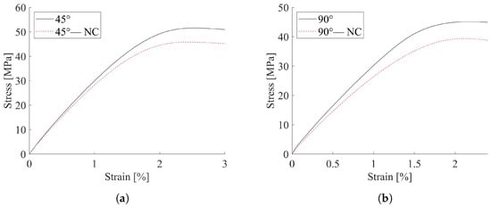 The 0° specimens resulted in the higher values of the elastic modulus, strength and correspondent deformation at peak stress. The 45° samples presented a drop in the elastic modulus of about 5% and a reduction in strength of 10%, while the 90° specimens carried out a tensile strength lower than 21% with respect to the 0° direction. The effect of contour was estimated and representative results for the 45° and for 90° infill direction are, respectively, reported in Figure 3a,b. A comparison with the correspondent contoured specimen outcomes is also shown in the same figure. The different behavior could be related to the way the infill lines are loaded. Indeed, in the 0° specimens all the filament lines were aligned to the loading direction. Therefore, they were loaded along their axis. Instead, the 90° specimens were orthogonal to the load, thus the resultant interface between adjacent filaments was much more stressed than in the 0° specimens. Moreover, samples with an outer wall presented contour lines always oriented at 0°, i.e., the stiffer direction. Despite only one outer wall line being used, the experimental stress–strain curves of contoured 45° and 90° samples were considerably influenced by its presence. The hygroscopic nature of the PLA material [38] and manufacturing flaws can influence the behavior of printed samples. Within this context, thermal treatments, in particular cooling conditioning, could provide performance degradation.