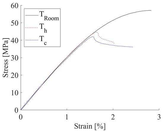 The quasi-static tensile behavior of thermal conditioned sets is graphically reported in Figure 4. In comparison with the untreated material, a fairly negligible difference (<3%) was detectable in elastic modulus, whilst a decay of about 25–29% in strength was noticed. The cooled specimens were demonstrated to have worse mechanical behavior.