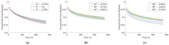 Trend of normalized creep modulus at room temperature; (a) 0° infill orientation; (b) 45° infill orientation; (c) 90° infill orientation.