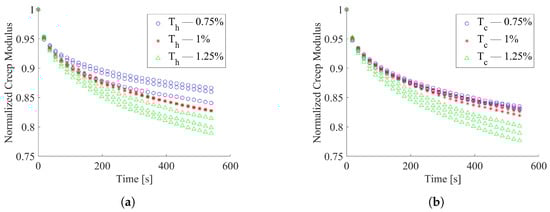 The 0° and 45° tested specimens resulted in less dispersed data compared to that showed by the 90° specimens. The average creep modulus decay, in the investigated , was estimated to be equal to about 13%, 11% and 13%, respectively, for 0° and 45° and 90°. The outcomes of relaxation tests on the thermally conditioned 0° specimens, here reported in Figure 6a with regard to heating treatment and in Figure 6b for those subject to cooling, showed higher data scatter than unconditioned ones. Both thermal treatments produced an increment of the creep modulus decay with respect to the unconditioned test outcomes.