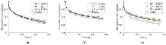 A graphical representation of the Findley empirical model outputs and the experimental outcomes, in terms of normalized creep modulus, is presented in Figure 7a for 0°, in Figure 7b for 45°, and in Figure 7c for the 90° infill direction.