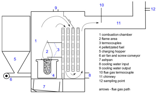 The study investigated the use of a low-power, fully automated retort boiler with a nominal power of 31.5 kW (VARIANT SL-33 A, produced by Slokov, Moravský Písek, Czech Republic). The operating parameters of the device were regulated using a controller. The readings of the temperature sensor and lambda probes enabled the control unit to adjust the energy carrier and air supplied to the combustion chamber to provide suitable doses. An exhaust gas fan and auger coupled with a pellet hopper regulated the air and fuel doses. The heat produced from the fuel thermal conversion process was transferred to the environment through two fan heaters with a heating capacity of 30 kW each. The combustion process was continuous, and the doses of air and fuel were injected periodically over short periods. These parameters were the same for each type of biomass fuel used in the combustion process. A schematic diagram of the boiler is presented in Figure 1, showing the locations of the thermocouples and sampling points.