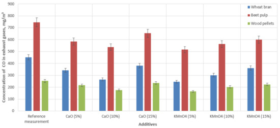 During the biomass waste combustion process, the CO emissions reached levels of 451 mg‧m−3 for wheat bran pellets and 746 mg‧m−3 for beet pulp pellets. Carbon monoxide emissions during the combustion of commercial fuel (wood pellets) reached a level of 252 mg‧m−3. The use of additives in combination with fuel during combustion reduced the CO concentration in the exhaust gases in each case. During the combustion of wheat bran pellets, carbon monoxide emissions decreased, on average, by 15–41% using a CaO-based additive and 20–45% using a KMnO4-based additive. When burning the beet pulp pellets, the CO emissions were reduced by 12–21% using a CaO-based additive, depending on the additive concentration, and 19–30% using a KMnO4-based additive, also depending on the concentration of the active substance. While feeding the boiler with wood pellets, the CO emissions into the atmosphere were reduced by 8–18% using CaO, depending on the concentration of the substance, and 3.5–30% using KMnO4. These data were the average values of two measurement sets.