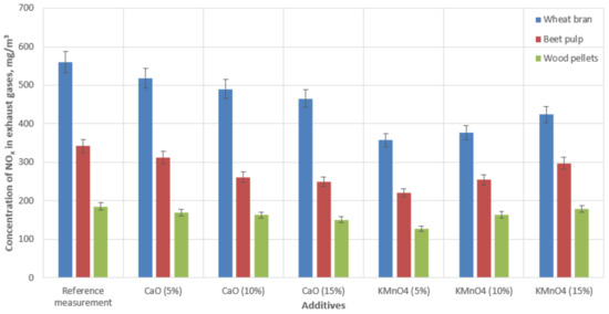 We recorded the concentrations of nitrogen oxides emitted during the combustion of the biomass pellets. NOx emissions varied around 559 mg‧m−3 during the combustion of wheat bran pellets, 341 mg‧m−3 in the case of beet pulp pellets, and 185 mg‧m−3 for wood pellets. The addition of the CaO-based additive reduced the NOx emissions by 7–16% (wheat bran pellets), 8–27% (beet pulp pellets), and 8–18% (wood pellets), depending on the concentration of the substance. Burning the biomass with the KMnO4-based additives also succeeded in reducing the concentrations of nitrogen oxides in the flue gas. Using this additive, NOx emissions were reduced by 24–36% (wheat bran), 12–35% (beet pulp), and 3.5–30% (wood pellets), depending on the concentration of the active substance. These data were the average values of two measurement sets.