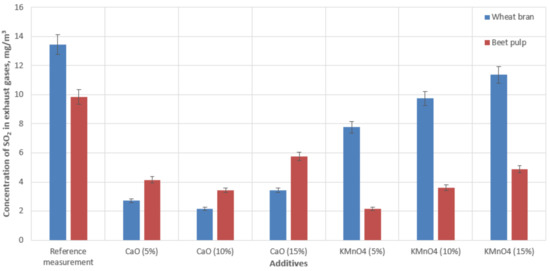 We also recorded reduced concentrations of SO2 during the process of burning wheat bran and beet pulp with additives. No reduction in the composition of exhaust gases was observed while burning wood pellets in the boiler. The SO2 emissions were 13.4 mg‧m−3 during the combustion of wheat bran pellets and 9.8 mg‧m−3 in the case of beet pulp pellets. Each of the additives in combination with the biomass fuel produced a reduction in SO2 concentration in the exhaust gases. While burning wheat bran, the SO2 emissions decreased by 74–83% using the CaO-based additive and 15–42% using the KMnO4-based additive, depending on the concentration of the active substance. In the case of burning beet pulp pellets, the SO2 emissions were reduced by 71–87% using the CaO-based additive and 41–65% using KMnO4, depending on the concentration of the additive. These data were the average values of two measurement sets.