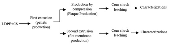 Considering the information available in the literature, the main objective of this work was to produce low-cost porous polymer membranes with an easy-to-control simple process based on different formulations (concentration/composition) and extrusion parameters (temperature profile, screw speed, flow rate, etc.). To have a more sustainable product, a biobased material (corn starch) was combined with an easy-to-recycle polymer (polyethylene).