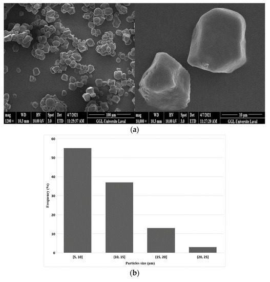 Figure 3a shows that the corn starch particles had a polyhedral shape and an alternating structure between amorphous and semicrystalline phases that were insoluble in water at room temperature. The crystallinity of starches is related to the double helical chains of amylopectin, the affinity of the crystalline zones, and intermolecular hydrogen bonds [17]. Analysis of the particle size distribution (Figure 3b) revealed an average size around 10 μm with a standard deviation of 4 μm.