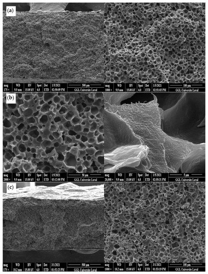 The membrane morphology was analyzed by SEM using a JEOL JSM-840A (JEOL, Tokyo, Japan). The samples were first immersed in liquid nitrogen (30 s) and then broken to obtain cross-sections and longitudinal sections. The pore size distributions, pore density, and total porosity were calculated by analyzing the SEM images using the Image J (1.53e) software (National Institutes of Health, Bethesda, MD, USA). The pore diameter was determined by using the equivalent spherical area, while the pore density (N) was calculated as follows [13]: