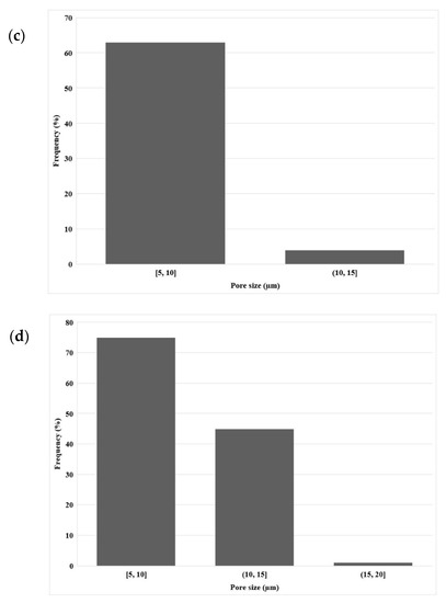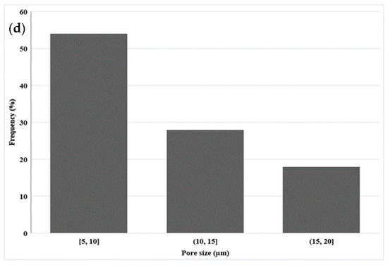 Figure 4a presents SEM images of the LDPE membrane after CS leaching. It can be seen that the membrane had a microporous structure with a density of 811 pores/μm3 as calculated using Equation (2) and a CS extraction efficiency of 91% as calculated using Equation (1). As Figure 4b shows, there were still CS particles that were not extracted, confirming that 100% extraction was not achieved. Nevertheless, mainly open pores were observed allowing good connectivity, but some closed pores were visible, explaining why some CS particles were not completely extracted, as they were totally isolated (encapsulated) by the matrix. The pore size distribution inside the LDPE (Figure 4d) led to an average of 10 µm with a standard deviation of 5 µm. This shows that, during extrusion, the shear and elongation stresses did not modify the CS particles as the pore sizes were similar to the initial CS size (Figure 3).