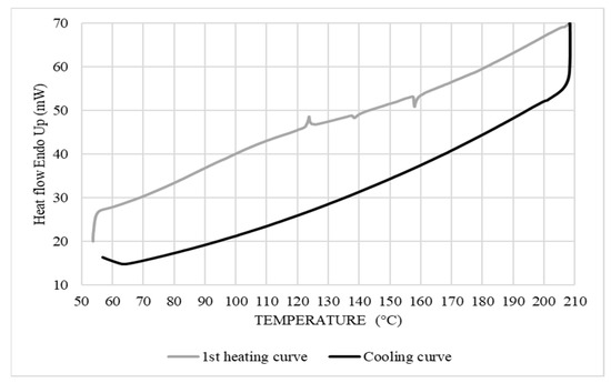 The melting temperature (Tf) and enthalpy of melting (ΔHf) were determined from the endothermic melting curve, while the crystallization temperature (Tc) and enthalpy of crystallization (ΔHc) were obtained during the cooling cycle (Figure 6). Corn starch has amorphous regions, crystalline regions, and lipid complexes of amylose with low water content, generating a high gelatinization temperature of 124 °C and ΔHf of 1.5 J/g. Thus, all these peaks could be observed, although the first peak was not very sharp with a Tc of 138 °C, reflecting partial crystallization, while the presence of the crystallization peak at 158 °C with a ΔHc of 1.72 J/g upon heating was attributed to CS being a semi-crystalline polymer that can also undergo reorganization during the heating cycle [18].