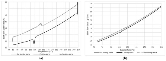 The heating and cooling thermograms obtained by DSC for LDPE are presented in Figure 7, while Table 1 reports the values for the melting temperature (Tf), crystallization temperature (Tc), enthalpy of melting (ΔHf), enthalpy of crystallization (ΔHc), and degree of crystallinity (Xc) for this LDPE. The Tf of 125 °C is very high compared to the expected melting temperature for pure LDPE which is usually around 114 °C [19,20]. After erasing the thermal history, the second heating curve showed the presence of two nonseparated melting peaks with a maximum peak of 124 °C and a second one at 120 °C to give ΔHf = 18 J/g. A second DSC analysis was performed at a lower heating rate (2 °C/min) to verify this bimodal behavior. However, Figure 7 shows the same result as for a heating rate of 10 °C/min. This can indicate two things: either the LDPE had some contamination/additive (a copolymer or a mixture of different types of PE), or that a single material was present but with two different crystal structures or a wide distribution of molecular weight [21]. However, the cooling curve showed a single crystallization peak. Therefore, it the second case is most likely, i.e., a single material with two peaks, corresponding to a semicrystalline structure peak (high peak) and a high-energy crystalline structure peak which can melt more easily (low peak).