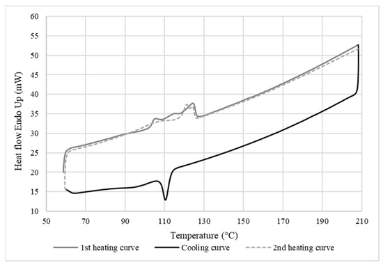 Figure 8 shows that the melting and crystallization temperatures of the LDPE membrane after leaching were the same as the neat LDPE (Figure 7), indicating that the LDPE/CS blends were incompatible. Furthermore, no significant increase in membrane crystallinity was observed (Xc = 17%), which supports the SEM analyses (Figure 4), indicating that CS was not fully extracted and that both phases were immiscible or had very weak interactions. The triple peaks at 104 °C, 114 °C, and 124 °C obtained during the melting of LDPE show that the matrix was composed of crystals of different sizes and types (different types of nucleation), indicating that the low number of small CS particles remaining could act as heterogeneous nucleation sites.
