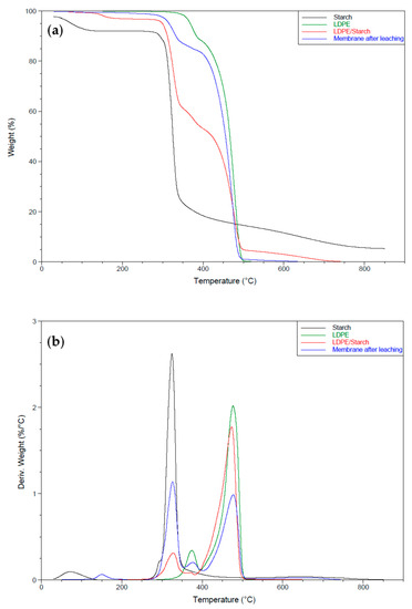 Figure 9 presents the thermograms under N2, while Table 2 summarizes the TGA results of the curves for CS, LDPE, and the membrane. The results show two distinct weight losses for the CS curve. A first loss (5.7%) with an initial decomposition temperature between 40 and 135 °C corresponded to the loss of volatile products (mainly water) [22], while the second was associated with the decomposition of the starch molecules between 253 °C and 650 °C (82.2% loss) [23]. Above this temperature, the weight loss (4.4%) could be associated with inorganic impurities and residual carbon [24]. The neat LDPE curve also showed two weight losses: the first loss (11%) with a decomposition temperature between 317 °C and 392 °C corresponding to a compound with a low molecular weight, and a second loss (88%) between 393 and 500 °C corresponding to the main LDPE chain [25]. This indicates that only one material (LDPE) was present, but with a different morphology (nucleation), as reported by the DSC results (Figure 7). The curve for the LDPE/CS sample showed four mass losses. The first (2.7% between 130 °C and 190 °C) was associated with the loss of small molecules (volatiles) not removed during extrusion. The second loss (34.3% between 278 °C and 344 °C) was associated with the thermal degradation of CS. However, this indicates that the thermal stability of CS decreased during blending (Table 2), while the thermal degradation of LDPE remained similar to the neat LDPE with two successive losses of 8% and 49% in the ranges 344–391 °C and 391–500 °C, respectively. The residue (4.9%) at 500 °C was considerably higher than for the neat LDPE, which was associated with CS. This curve also shows that the mass loss associated with CS (41%) was slightly lower than its content in the initial mixture (LDPE/CS = 50/50). This means that the distribution of CS in the matrix was not totally uniform or that the extraction rate was not uniform (or a combination of both effects). The curve for the LDPE membrane after extraction showed three mass losses. The first loss (2.4% between 178 °C and 303 °C) was negligible and associated with the thermal degradation of residual CS, confirming the results of a high extraction rate. The second loss (13% between 303 °C and 389 °C) corresponded to additives, while the third loss (83% between 389 °C and 496 °C) was associated with the complete thermal degradation of LDPE. For the conditions used, the thermal stability of LDPE in the membrane was similar to the neat LDPE, i.e., no change was associated with the blends with CS in the extruder.