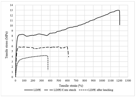 The tensile mechanical properties are summarized in Table 4 according to the stress–strain curves presented in Figure 10. It can be noted that the addition of CS decreased the Young’s modulus of LDPE from 84 to 68 MPa, as well as the tensile strength from 8 to 5 MPa. These decreases were associated with a lack of compatibility between both components due to their different hydrophilic/hydrophobic characters (corn starch vs. LDPE). In addition, the lower LDPE tensile strength after CS addition is again an indication of weak interfacial interactions between the components, leading to mechanical failure at their interface [27]. Another explanation is linked to the intrinsic properties of starch. It is known that corn starch is brittle and has low mechanical properties, such as tensile strength (1.49 MPa), elongation at break (51%), and Young’s modulus (14.2 MPa) [28]. Lastly, the membrane after extraction had the lowest tensile properties due to the formation of the porous structures (presence of voids in Figure 4 and Figure 5). In this case, there was less material available to sustain the applied stresses.