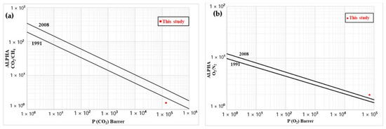 As a tradeoff always occurs between selectivity (α) and permeability (P), Figure 11 compares the results with standard Robeson upper bounds [34,35]. The CO2/CH4 (biogas sweetening) data were close to the 1991 upper bounds, while they overcame the 2008 bound for O2/N2 (oxygen-enriched air). For N2/CH4 (natural gas purification), the data were well above the 2008 upper bound. These results indicates that the membrane prepared can be a very good starting point for specific high-throughput separation of these gases (CO2/CH4, O2/N2, and N2/CH4), which will be the focus of future work.