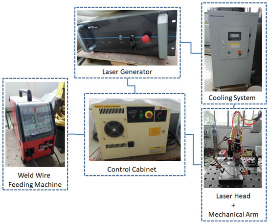 The overlay process was performed using both Ar-protected TIG welding and laser welding in individual processes, in order to determine the most economic, efficient and qualified coating strategy. A Panasonic YC400TX DC power source was used in the manual TIG welding process. Since laser welding requires more precise control of both the laser power and weld wire feeding speed, a laser welding station was proposed, consisting of a control cabinet, an MFSC 3000X single-module continuous-wave (CW) fiber laser generator, a WF007A weld wire feeding machine, a FANUC mechanical arm with a laser head, and a water cooling system, as shown in Figure 1.