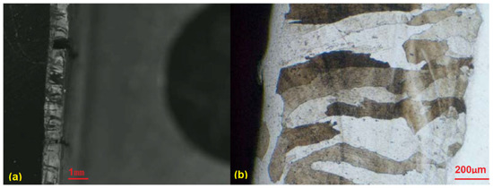 Metallographic analysis of the manual TIG welded sample: melting zone (a) and coating layer (b).