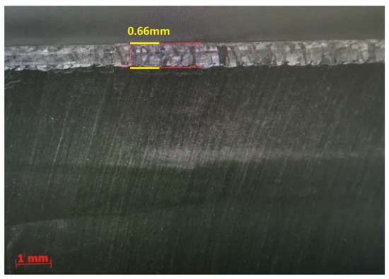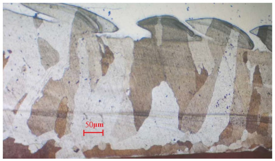 The welding layer obtained from the laser welding using the first set of parameters is about 1.0 mm thick. The surface of this layer contained pores and fairly coarse grains, as can be observed in Figure 8. During the side bending tests, multiple cracks appeared and the crack depth exceeded more than half of the weld layer. After optimization of the laser welding parameters, the thickness of the coating layer was polished and tested. No defects could be found after PT tests, and the remaining coating layer was reported to be around 0.6–0.7 mm thick (as shown in Figure 10). As can be noticed from Figure 11, much finer columnar grains were reported to appear at the surface of the welding layer, and no obvious pores or feather-like upper bainite could be found, which could be used to explain its better mechanical properties when compared to the samples prepared using manual TIG welding. Moreover, as can be observed from Figure 12, no visible cracks were found after the side bending tests, which can preliminarily prove the feasibility of improving the mechanical performances of the sample plate by reducing the thickness of the welded layer and refining the grains inside it. This could be realized by properly adjusting the operational parameters of laser welding processes.
