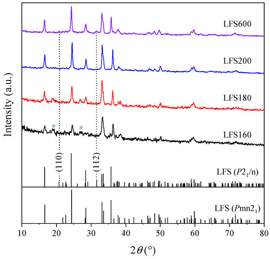 XRD patterns of the as-prepared samples are presented in Figure 1. The standard lines of monoclinic Li2FeSiO4 (P21/n space group, PDF#97-024-6132) and orthorhombic Li2FeSiO4 (Pmn21 space group, PDF#97-016-1306) are also included for comparison. The results show that the orthorhombic Li2FeSiO4 structure was formed through hydrothermal reactions at 160, 180 and 200 °C, which is consistent with that of the Li2FeSiO4 obtained by the hydrothermal reaction at 200 °C without adding ascorbic acid [37]. The characteristic diffraction peaks observed from LFS600 in Figure 1 were ascribed to the (110) and (112) crystal planes of monoclinic Li2FeSiO4 (P21/n space group), indicating a phase evolution from orthorhombic to monoclinic [37].