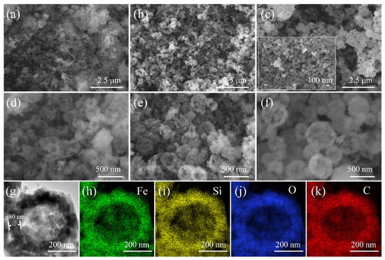 Morphologies of the Li2FeSiO4 samples. (a–f) SEM images of LFS160 (a,d), LFS180 (b,e) and LFS200 (c,f) (the inset in (c) is nano-LFS200). (g) TEM image and (h–k) EDX mapping images of Fe, Si, O and C for LFS600.