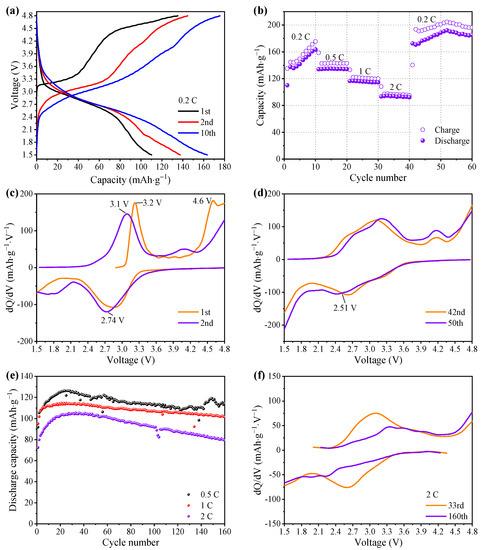 Electrochemical performance of the sample LFS600 at 1.5–4.8 V and 30 °C (a) Charge–discharge curves of the 1st, 2nd and 10th cycles at 0.2 C, (b) rate performance (1 C = 166 mA·g−1), differential capacity curves of (c) the 1st and 2nd cycles, and (d) the 42nd and 50th cycles, (e) cycle performance at 0.5, 1 and 2 C, and (f) differential capacity curves for the 33rd and 160th cycles.