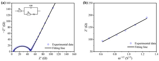 (a) Electrochemical impedance spectrum of the LFS600 under open circuit voltage, the inset is the equivalent circuit used to fit the data, and (b) linear fitting the data in the low frequency region of (a). The frequency values corresponding to the data points in (b) are 0.40949, 0.30888, 0.233, 0.17575, 0.13257, 0.1 Hz from left to right.