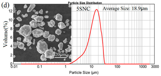 Particle morphology of raw powders: (a) gas-atomized AA2024 powder particles, (b) SiC nanoparticles, and (c,d) particle morphology and size distributions of the milled 1 and 5 vol.% SiC/AA2024 nanocomposite powders.