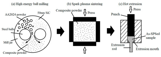 Table 1 shows the chemical composition of the raw powder. Two mixtures of gas-atomized AA2024 powder with a composition of Al-4.1Cu-1.6Mg (wt.%) with an average size of 20 μm (as shown in Figure 1a) and SiC nanoparticles with an average size of 50 nm (as shown in Figure 1b) were firstly carried out with planetary ball-milling for 24 h. The process was performed at a speed of 500 rpm with 1 wt.% stearic acid added as a process control agent (PCA) during milling. The diameter of the stainless-steel balls used for the milling was 10 mm, and the ball-to-powder weight ratio was 10:1. According to the literature [4], a nanocomposite with 10 vol.% SiC would display low ductility. As a result, SiC/AA2024 nanocomposite powders with the SiC nanoparticle content of 1% and 5% by volume were produced in the present study. The morphology and particle size distributions of the milled nanocomposite powders are displayed in Figure 1c,d, showing that the mean particle sizes of the 1 and 5 vol.% SiC/AA2024 nanocomposite powders are 22.3 and 18.9 μm, respectively. Figure 2 shows the preparation process of the SiC/AA2024 nanocomposite samples. The as-milled powders were then consolidated via spark plasma sintering (SPS) at 500 °C for 10 min under a pressure of 50 MPa. The as-sintered ingots were induction heated to 500 °C (holding for 5 min) at a rate of 100 °C/min. The hot extrusion process, with an extrusion ratio of 16:1 to produce samples of 7.5 mm in diameter, was carried out in an argon atmosphere. The as-extruded samples were heat-treated (HT) with a condition of solution treatment (502 °C for 2 h), quenching, and aging (140 °C for 4 h). The as-extruded and heat-treated 1 and 5 vol.% SiC/AA2024 nanocomposite samples were named 1SNC and 5SNC, as well as 1SNC-HT and 5SNC-HT, respectively.
