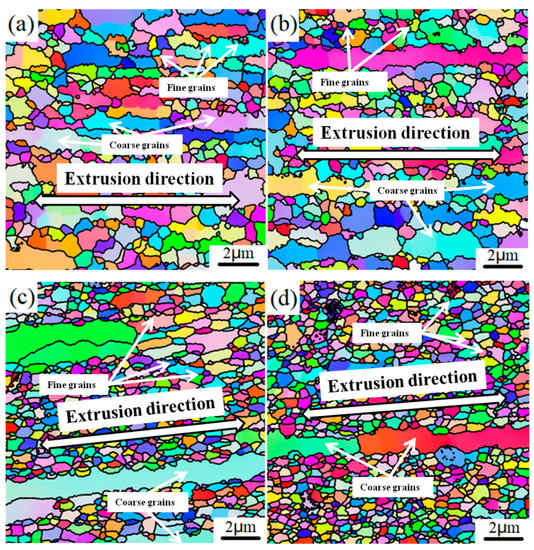 It is clear that a bimodal microstructure consisting of fine equiaxed grains (hard domains) and elongated coarse grains (soft domains) formed in the extruded 1SNC nanocomposite sample (as illustrated in Figure 5 and Figure 6). The fine equiaxed grains possibly resulted from the dynamic recrystallization, while the elongated coarse grains likely came from the abnormal grain growth during the SPS process. The high grain boundary energy related to the large area of grain boundaries due to the long time spent ball-milling could provide the extra thermodynamic driving force, helping grain growth [20]. After T6 heat treatment, the 1SNC-HT sample maintained a similar microstructure with a slight loss of grain size, from 424 to 411 nm, as displayed in Figure 5a,b and Figure 6a,b. When it comes to the 5SNC sample, a similar microstructure evolution also occurred, only with a much finer grain size of 305 nm compared to the 1SNC sample due to the high addition of SiC nanoparticles (5 vol.%).