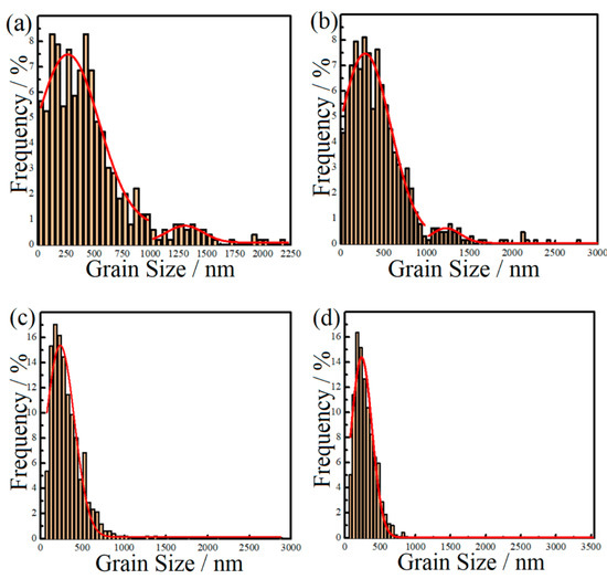 Aluminum grain size distributions of the nanocomposite samples: (a) 1SNC, (b) 1SNC-HT, (c) 5SNC, and (d) 5SNC-HT.