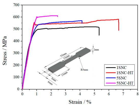 Tensile engineering stress–strain graphs of the 1SNC, 1SNC-HT, 5SNC, and 5SNC-HT samples. The inset is the sketch drawing of the tensile testing specimens.