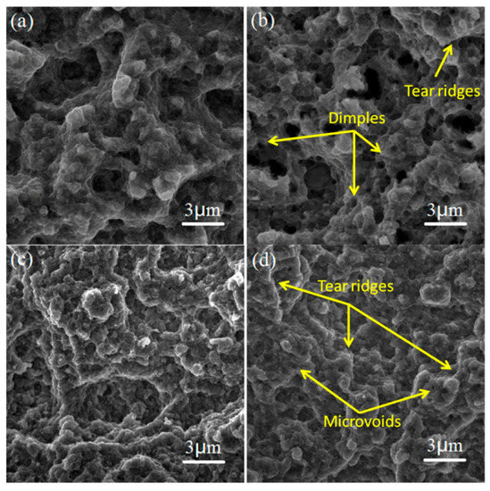 SEM secondary electron images of the fracture surfaces of the tensile test specimens cut from the SiC/AA2024 nanocomposite samples: (a) 1SNC, (b) 5SNC, (c) 1SNC-HT, and (d) 5SNC-HT.