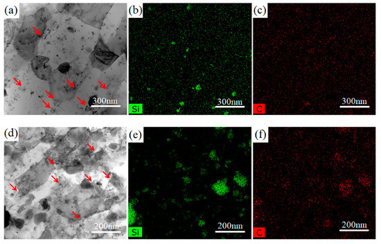 Figure 10 shows the STEM bright-field images and the corresponding EDS Si and C mappings of the 1SNC-HT and 5SNC-HT samples. It is noted that because of the low detection sensitivity of C, the distribution of Si element can be treated as the reflection of SiC nanoparticle distribution. As shown in Figure 10b,e, the SiC nanoparticles were mostly distributed at the grain boundaries (pointed out by red arrows in Figure 10a,d). Aggregation of SiC nanoparticles were detected in the 5SNC-HT sample, while they were better dispersed and more uniformly distributed in the 1SNC-HT sample, as shown in Figure 10b,e. Based on the STEM observation results, it can be estimated that the average sizes of SiC nanoparticles were 88 and 110 nm for the 1SNC-HT and 5SNC-HT samples. Due to the dispersion of SiC nanoparticles at grain boundaries, the grain boundary movement was impeded by the Zener pinning effect [29], which consequently inhibited grain growth during heat treatment. As a result, the bimodal microstructure remained, and the average grain size did not change significantly.