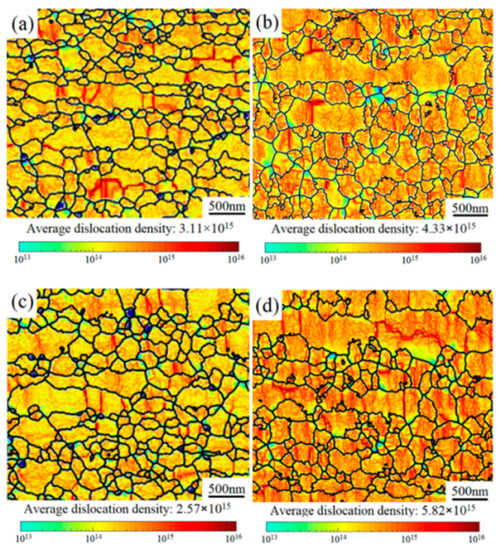 The distribution of GNDs in 1SNC samples can be described by means of the local misorientation calculated by EBSD, as shown in Figure 11a–d. After the tensile test, the GNDs were primarily accumulated, as indicated by the darker color in Figure 10d and Figure 11b. The calculated dislocation densities of the 1SNC and 1SNC-HT samples were 3.11 × 1015 and 2.57 × 1015, respectively. After tensile deformation, the dislocation densities increased to 4.33 × 1015 and 5.82 × 1015, respectively. The increment of dislocation density in the 1SNC-HT sample was more significant than that in the 1SNC sample during tensile testing, which means an increased ability of accumulating GNDs in the 1SNC-HT sample. This might be due to the low dislocation density in the 1SNC-HT sample after HT, which resulted in larger strain gradients between the soft domains (CGs) and the hard domains (UFGs) to help with producing more back stress. Combining the EBSD KAM map and dislocation density, it is quantitatively speculated that the 1SNC-HT sample can produce and accumulate an increased number of GNDs during tensile deformation, which is advantageous for an increase of ductility.