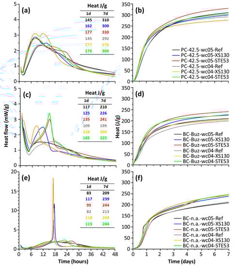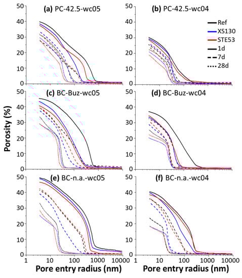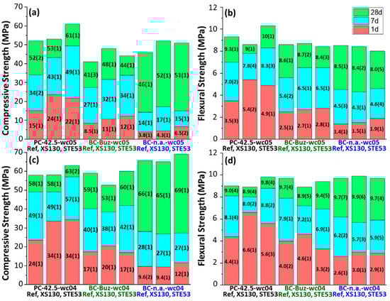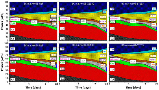 - Alite/C3S. For PC-42.5 and the two studied w/c ratios, the DoH of the alite was approximately 55, 75, and 90% at 1, 7, and 28 days, respectively. This is fully in line with the known behaviour of PC hydration [56,57]. This study cannot conclusively prove that the reaction rate of crystalline alite in PC-42.5 is increased by C-S-H gel nanoparticle seeding at the studied hydration times, i.e., 1 day or later. For BC-Buz, with both w/c ratios, the alite reaction degree is approximately 65, 80, and 85% at 1, 7, and 28 days. Again, the alite DoH is not significantly accelerated by these admixtures. The slightly higher reaction degree at the very early ages, when compared to PC-42.5, is likely related to the lower amount of C3S, which results in higher water-to-alite mass ratio(s). For BC-n.a., the alite DoH was approximately 60, 85, and 90% at 1, 7, and 28 days, respectively. In agreement with the previous observations, C-S-H seeding does not seem to accelerate alite hydration. Finally, these results, for the studied PC and hydrating times, do not support the widely known picture that C-S-H seeding accelerates alite hydration. Faster alite hydration at the very early ages, i.e., earlier than 24 h, cannot be ruled out with the experimental data reported here.
