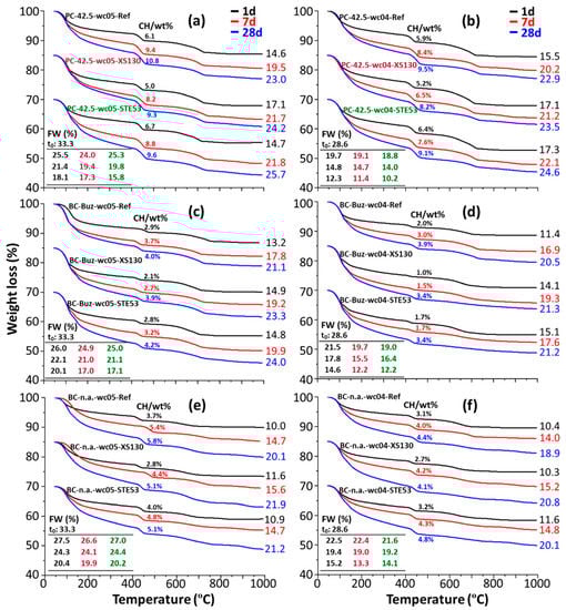 - Tricalcium aluminate/C3A. For PC-42.5 and both w/c ratios, the DoH of C3A was 7, 60, and 85% at 1, 7, and 28 days, respectively. The studied admixtures significantly accelerated C3A hydration. With some scattering in the results, the DoH of the studied pastes increased to 25, 65, and 90%. For BC-Buz, C3A had fully dissolved at 7 days. However, the hydration acceleration at 1 day was noteworthy. Finally, BC-n.a. did not contain C3A; hence, the role of the admixtures cannot be discussed.
