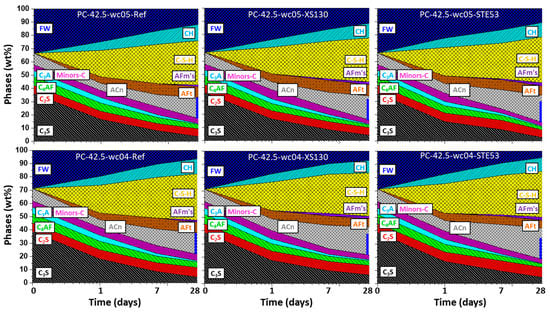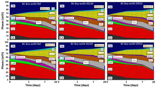 - Belite/C2S. As can be seen in Table 1 for PC-42.5, the belite did not significantly react in the first week. This is again in line with the known features of ordinary PC hydration [56]. This is not the case for the BC-Buz pastes. For w/c = 0.50, the belite reacted about 5% at 7 days and, even more importantly, about 35% at 28 days. For w/c = 0.40, the belite hydrated about 10 and 40% at 7 and 28 days. This enhanced DoH of belite is due to the sulphur activation in the clinkering stage, which can be mapped out by a larger belite unit cell volume [58,59,60]. The scattering of the results did not allow a firm conclusion on any significant acceleration of belite phase hydration by XS130 or STE53. For the non-activated belite cement, the belite did not react at 7 days in any studied paste. Without admixtures, the DoH of belite for both w/c ratios was approximately 20% at 28 days. The admixtures seem to moderately accelerate belite hydration at 28 days, XS130 to 40% and STE53 to 30%. However, this isolated result needs additional confirmation.