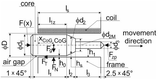 The used electromechanical solenoid HCNE1-1578 made by Zheijang Huaxin Electromechanical Co., Ltd. consists of an electromagnetic induction coil with z = 475 treads around a movable slug. The coil was shaped so that the armature can move inside it, thus altering the coil’s inductance and becoming an electromagnet. For the purposes of conducting the experiment for which the device was designed, the design of the solenoid punch was changed. A schematic drawing of the punch with its geometry is shown in Figure 3. Due to the design change, it was necessary to present calculations describing this change in order to determine their impact on the mathematical model of the punch’s behavior.