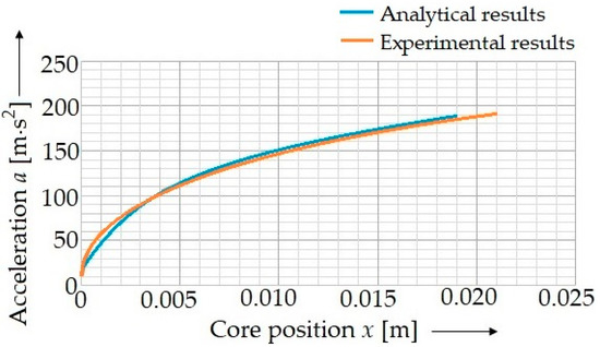 From the analytically determined result of force F, the friction force FT = 0.1 N must be subtracted, and the result must be divided by the punch mass. This way, it is possible to obtain a punch acceleration value depending on the position x. The determined dependence (16) was processed into a clear graph (Figure 6).