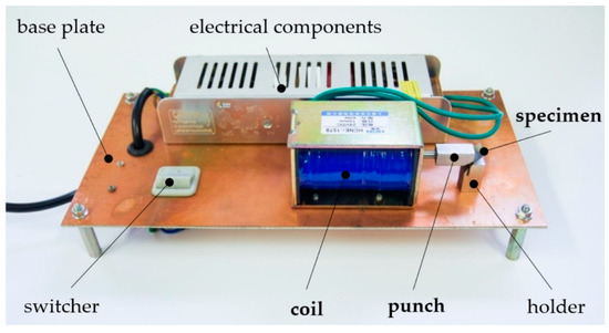 The experimental work was performed on the device itself, which is shown in Figure 8. As it can be observed, the experimental device consisted of several components. The main part was a base plate. Other components were mounted onto it. Electrical components included the needed part of the electrical circuit, for which a detailed description is not the subject of the current research. A switcher served to activate the device. A holder kept the metal sheet required for the bending position. It also determined the requested angle of the metal sheet. The most important components marked in Figure 8 are written in bold and they are, namely, a coil, a punch, and a specimen. The magnetic pulse was generated in the coil. Its effect then moved the punch against the specimen. The punch movement was stopped by a hit to the holder together with the specimen.