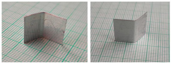 The specimens for the experiments were sheet metal strips cut into a rectangular shape with the dimensions of 23 mm (length) and 12 mm (width). The strips had two different thicknesses, namely, 0.15 mm and 0.20 mm. Figure 9 shows the final shape after the forming process. The specimen is depicted from both sides.