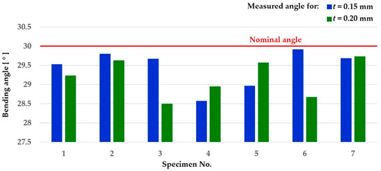 The results of the bending angle of specimens with the thicknesses of 0.15 mm and 0.20 mm and a comparison to the nominal set angle (defined by the holder).